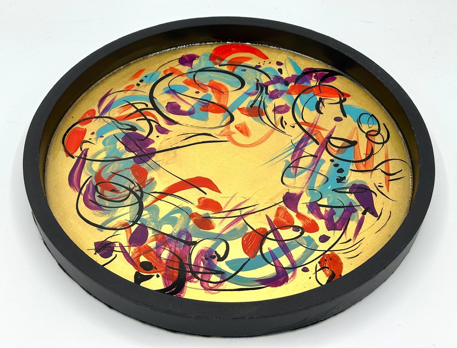 Celebrate everyday with the gold leaf abstract painted round with a black rim, and teal and red flourishes. It has styling appeal and functional flair. This round tray will dress up your console, tabletop or kitchen counter. Rotating wooden base makes for easy access.