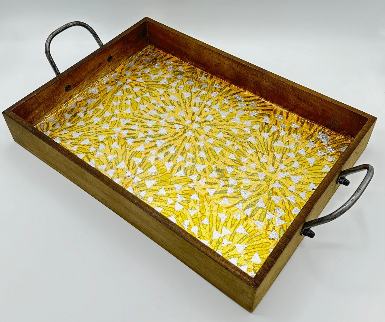 This versatile, multifunctional tray with its distinctive design of mosaic triangles of silver leaf over gold and copper leaf starbursts is ideal for serving meals or snacks. It is sealed with a double coat of food safe epoxy resin. Serve from the kitchen to table - anywhere. Has a metal handles for ease of carrying from here to there.