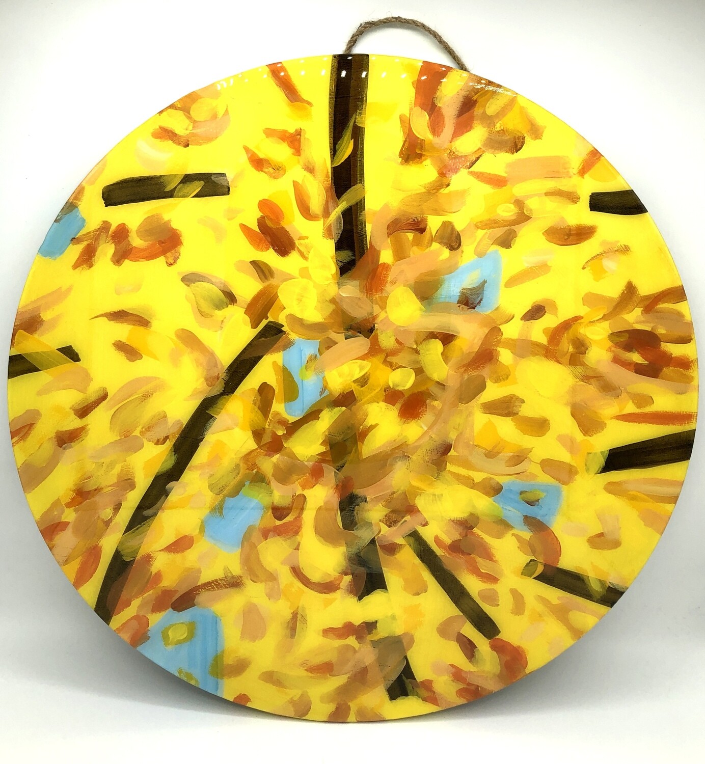 This versatile, multifunctional board/platter with its abstract yellow leaves and trees and patches of blue sky design is ideal for serving meals or snacks. It is sealed with a double coat of food safe epoxy resin. Serve from the kitchen to table - anywhere. Has a loop for hanging when not serving!